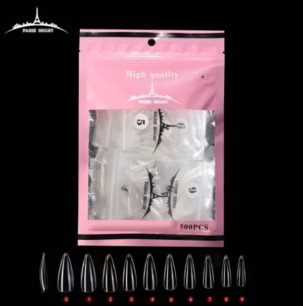Tips para soft gel / press on – 500 uñas por paquete en 10 medidas diferentes forma Stiletto